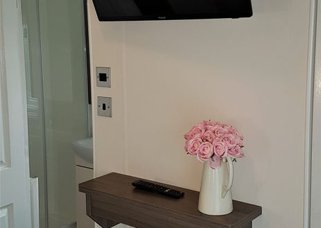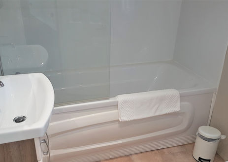 The master bedroom has a twin bed, 32" Freeview flat screen TV, a walk-in wardrobe and cupboard space and an en-suite with shower cubicle and toilet for complete relaxation. The twin bedroom is fitted with twin single beds, 32" Freeview flat screen TV, wardrobe, and cupboard space. There is also a separate bathroom with shower over bath, toilet, and heated towel rail.
